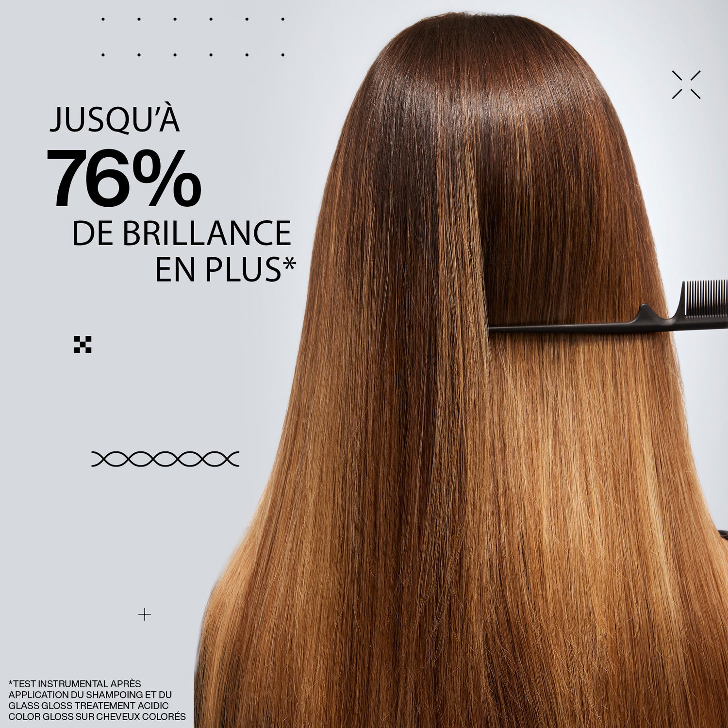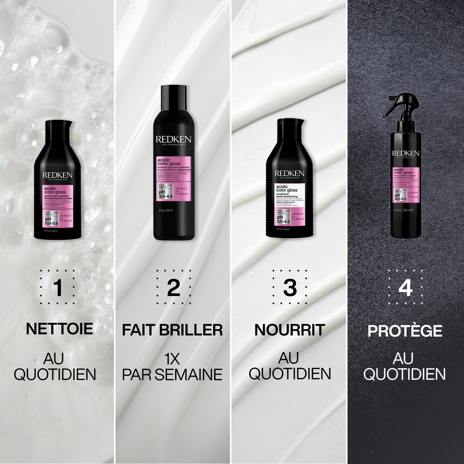 - Des cheveux hydratés, renforcés et intensément nourris.*Test consommateur après application du Shampoing, du Traitement brillance professionnelle et du soin sans rinçage Acidic Color Gloss.