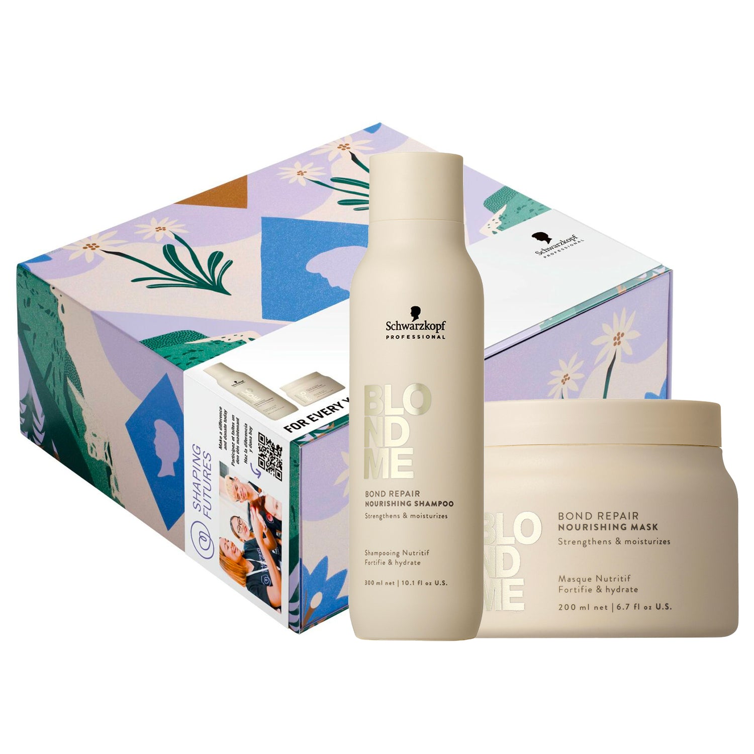 - Shampoing Nutritif BlondMe (300 ml) : nettoie en douceur tout en nourrissant la fibre capillaire et en protégeant les reflets blonds.- Masque Nutritif BlondMe (200 ml) : soin profond qui hydrate intensément, renforce la structure interne du cheveu et sublime la brillance des blonds.