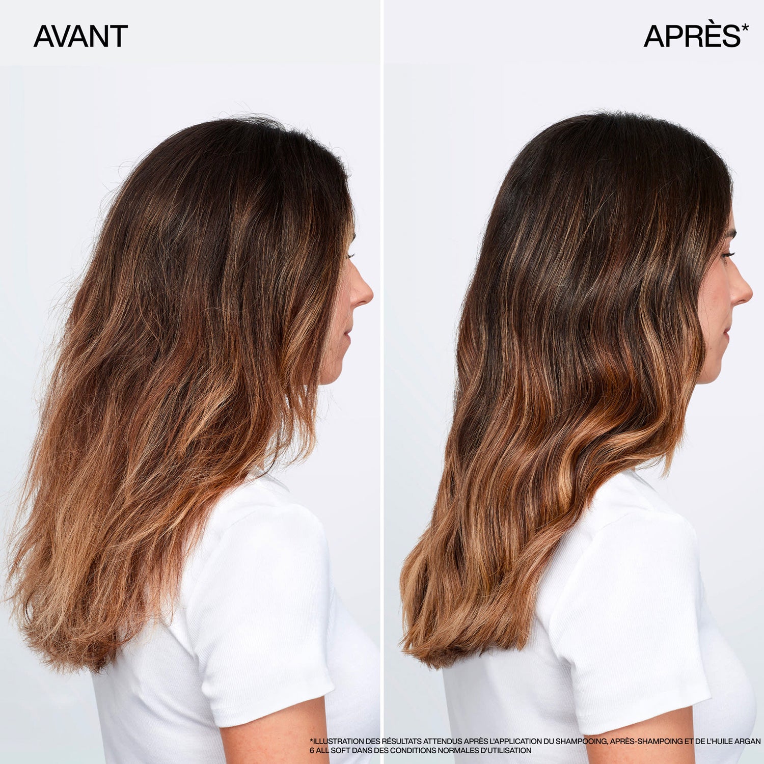 Formulé avec de l'huile d'argan et des actifs hydratants et adoucissants, le shampoing All Soft rééquilibre le taux d'hydratation et de nutrition de la fibre capillaire.