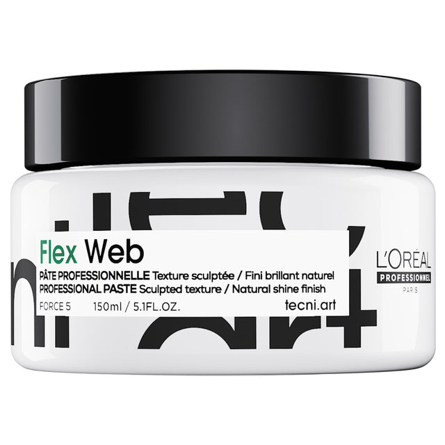 Tecni Art Flex Web de L'Oréal Professionnel est une pâte avec des fibres sculptantes innovantes pour modeler, sculpter et définir les cheveux en laissant un fini naturellement brillant.Maintenez élastique.